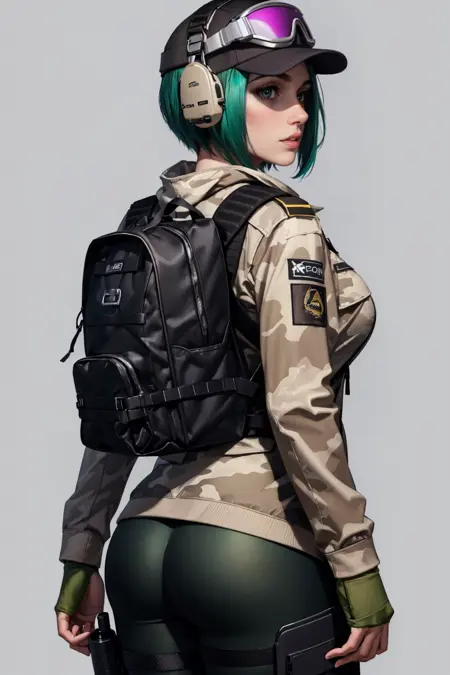 Default Outfit: green hair, goggles, hat, fingerless gloves, headset, jacket, camouflage jacket, backpack, holster, pants