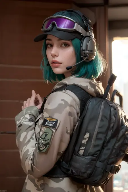 Default Outfit: green hair, goggles, hat, fingerless gloves, headset, jacket, camouflage jacket, backpack, holster, pants