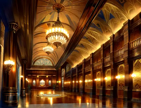 I also used terms like 'intricately designed' (metal, marble, wood, ) (wall, ceiling, ) panels, and intricately designed (doors, elevator doors, windows, ). Also (marble, wood) (floor, walls, ceiling, ). I also used prompts for stairs and staircases, for plain, spiral version, escalator version, and luxury. Keep in mind using the word stairs makes the stair show up near all the time and often in varied ways. Words for furniture like couches, tables, dining tables, chairs, desks, shelves, fireplaces, and others were used in pictures that had them shown. Terms like 'luxury' and 'intricately designed' were used often as I wanted to show idealistic and masterpiece examples of interior Art Deco design.