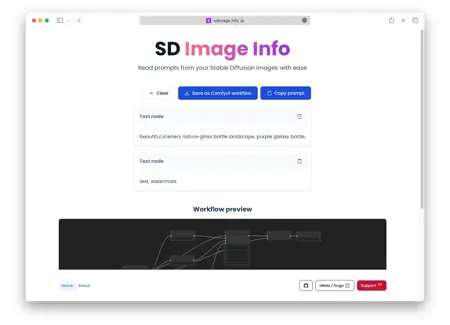 使用 SD Image Info,您可以通过与 ComfyUI 本身相同的用户界面节点预览 ComfyUI 工作流。