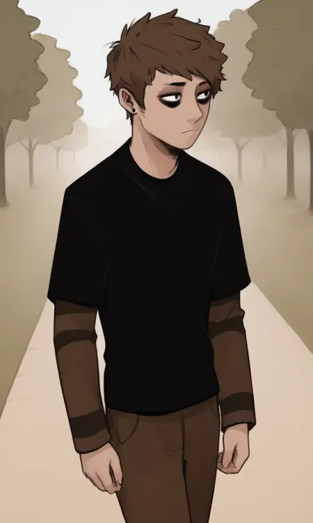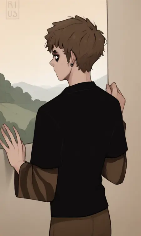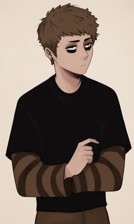 humanrigby, brown hair, black eyes, earrings, short hair, bags under eyes