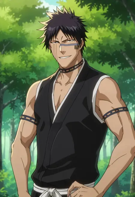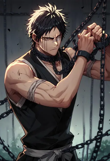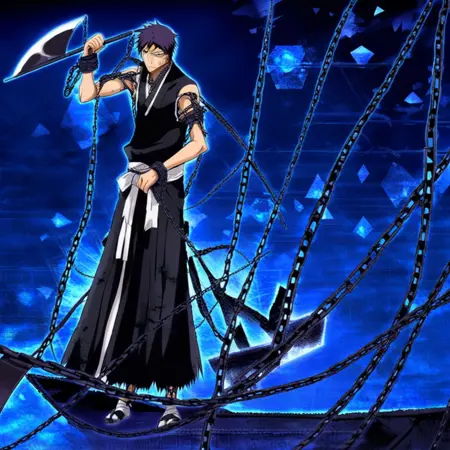 뱅카이: 츠루헤이 히사기 은카이, 낫과 사슬 무기 들고 있음, 사슬에 둘러싸임, 목에 사슬이 감김, 머리 위에 사슬 구체