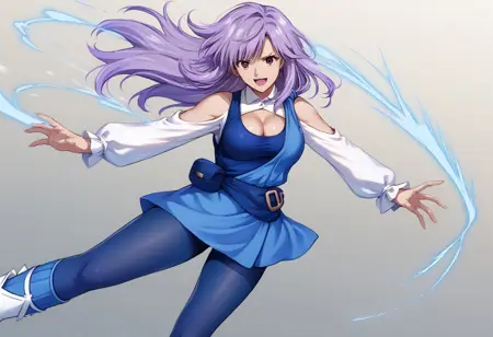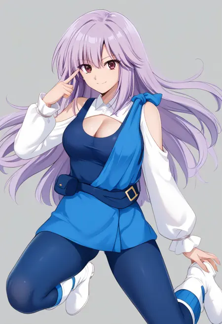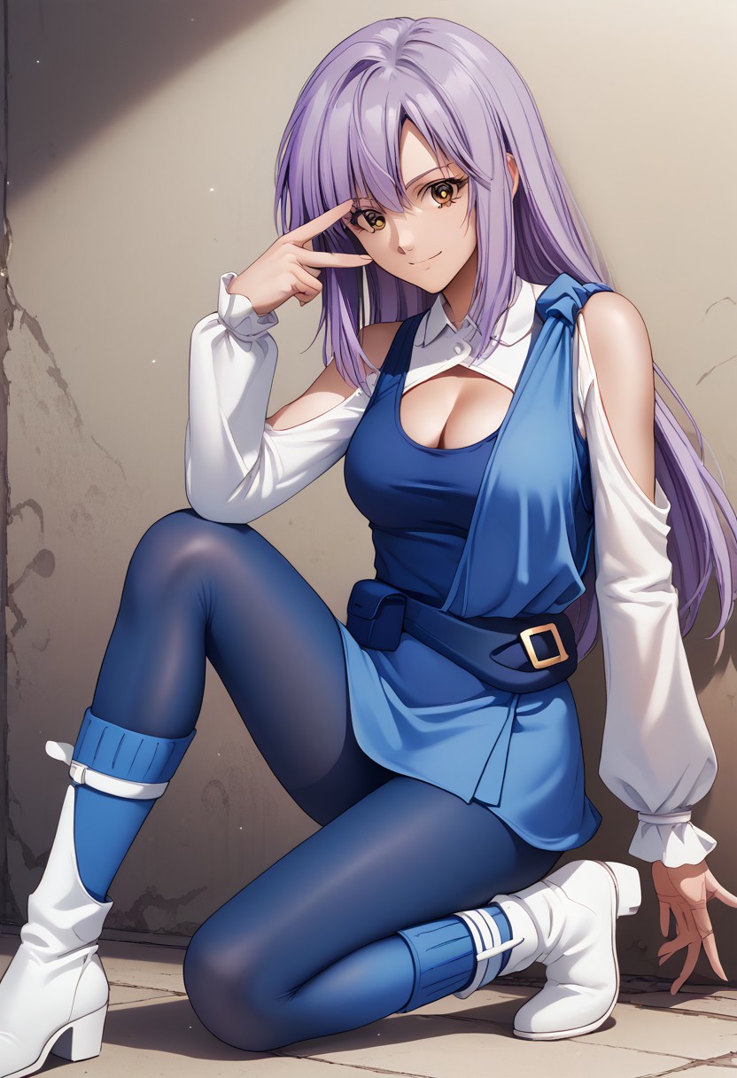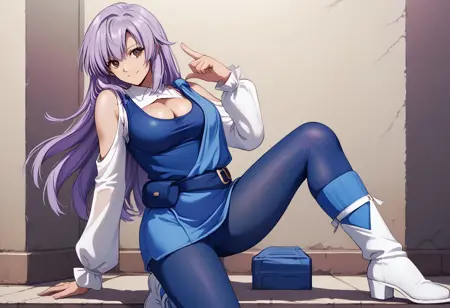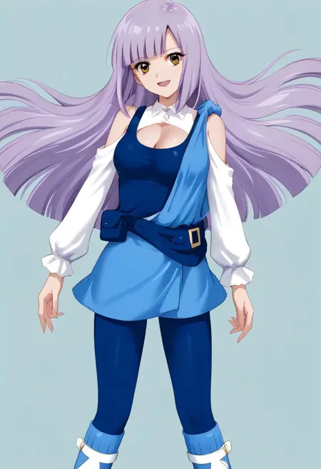 服装: 蓝色背心,露胸剪裁,白色袖子,露肩,浅蓝色短裙,腰包,蓝色连裤袜,浅蓝色腿套,白色靴子