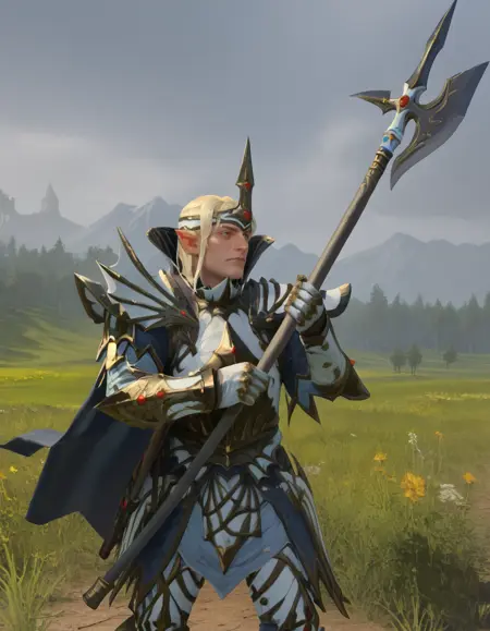 Imrik, male focus, pointy ears, armor, holding halberd,