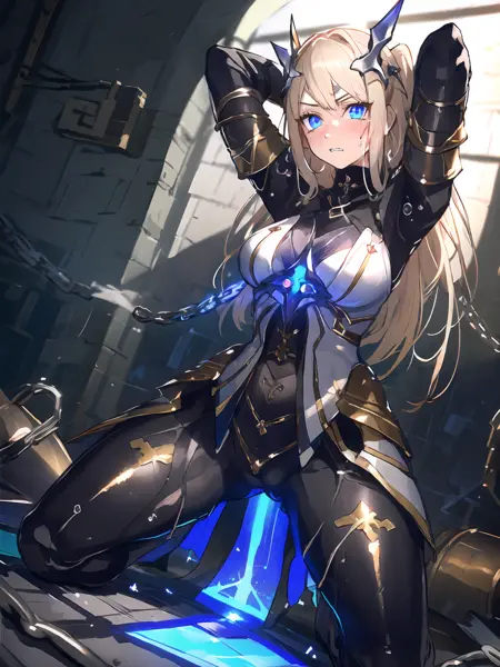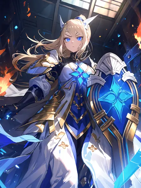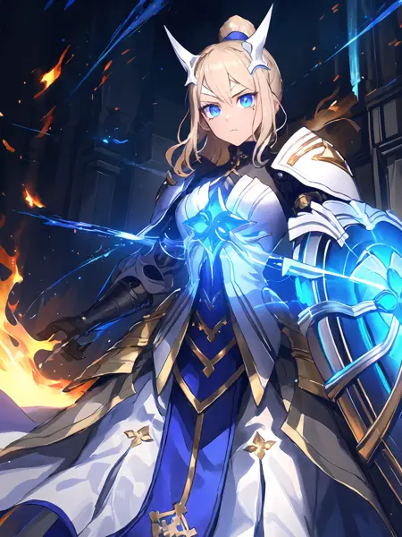 一些关键词如“护甲”、“持剑(盾)”、“发光”、“星形瞳孔”等可能有助于增强服饰表现,使画面更贴近原作艺术风格。