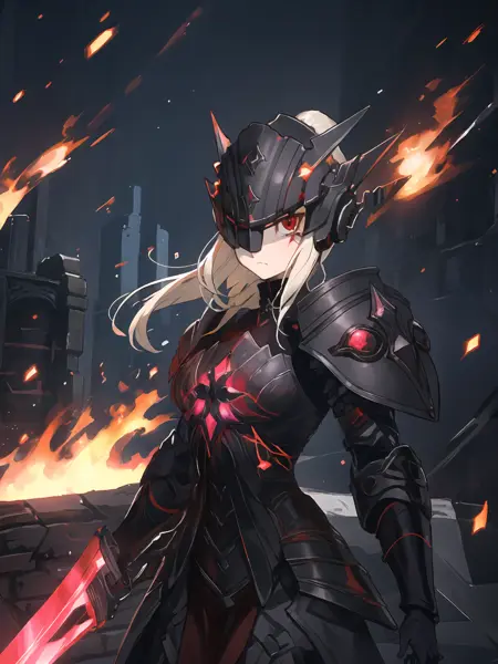 阴暗面:发饰,黑色护甲,黑红相间长裙,异色瞳,红色眼睛,(黑色头盔,破损头盔,单眼遮挡 / 双眼遮挡),丝带;