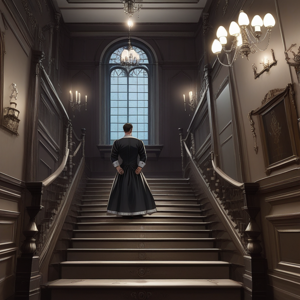 オプション:室内、階段、シャンデリア、窓、夜、不気味