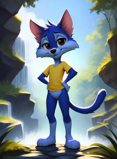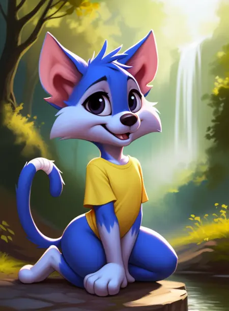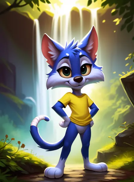 FurrballCatLonTun, cat, black nose, white sclera, blue fur, light blue belly, bandages on tail, yellow shirt, chibi,
