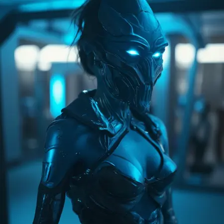 프로토스 기술과 시원한 외계 인형을 세련되고 외계적인 스타일로 이미지를 생성하세요.