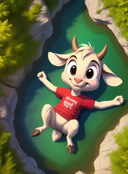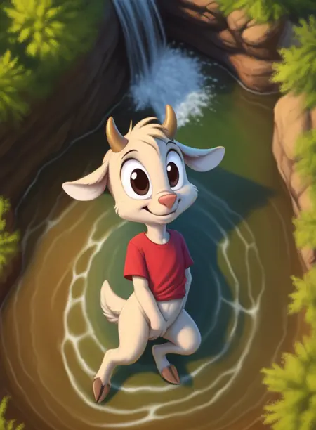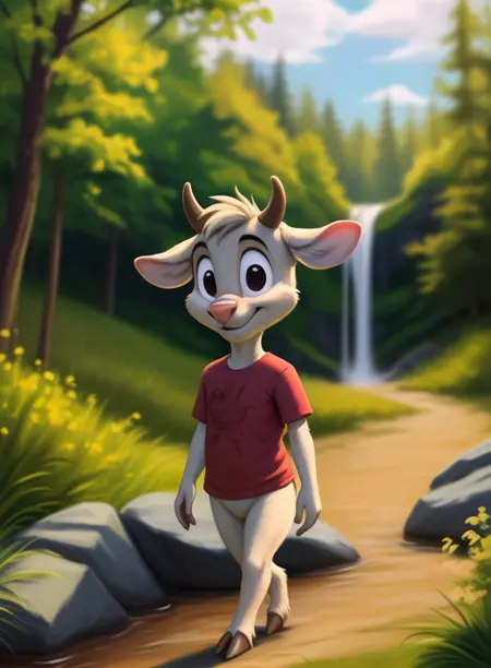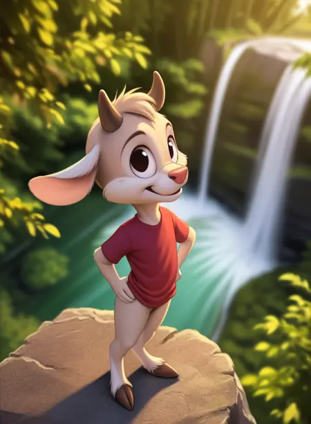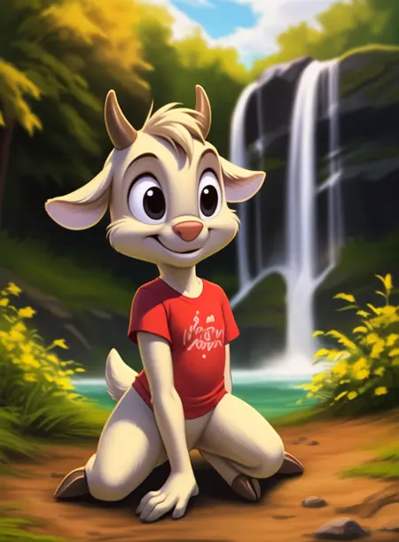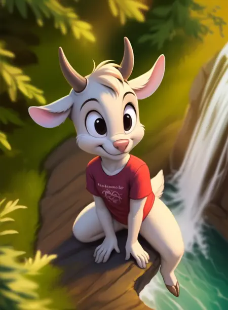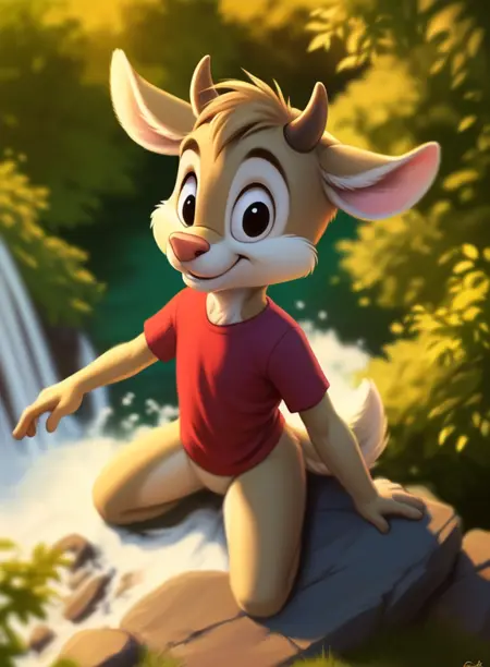 VinnieDeerLonToo, Deer, chibi, creamy fur, small horns,, brown hooves, pink nose, red t-shirt,( chibi, small body, )