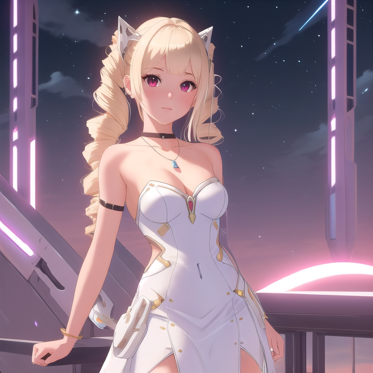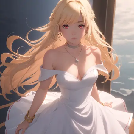 Shiro, Shiro \(Tower of Fantasy\), 1girl, solo, (drill hair, twin drills:1.3), blonde hair, bangs, red eyes, small breasts, looking at viewer, _dress, strapless dress, bare shoulders, bracelet, white dress, armlet, collarbone, necklace, choker