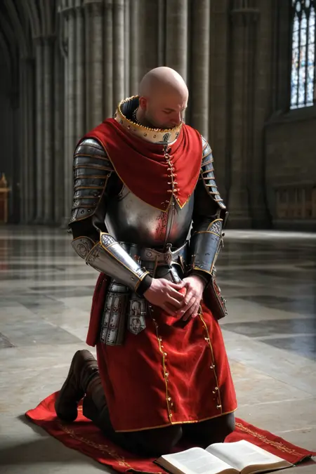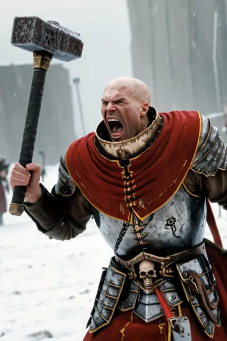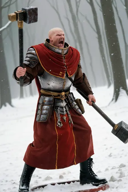 bald, male, war hammer, armor, capelet, book on waist, hammer symbol