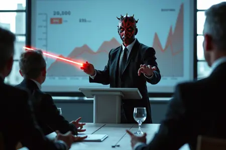 다스 마울은 경영 회계사로, 플럭스 시대에 버즈 경제가 쇠퇴하는 이유에 대해 회사 직원들에게 강의하는 모습, 리얼리스틱한 사진, 기업 복장
