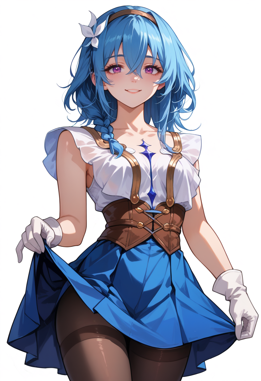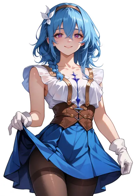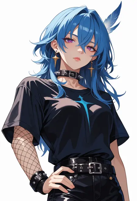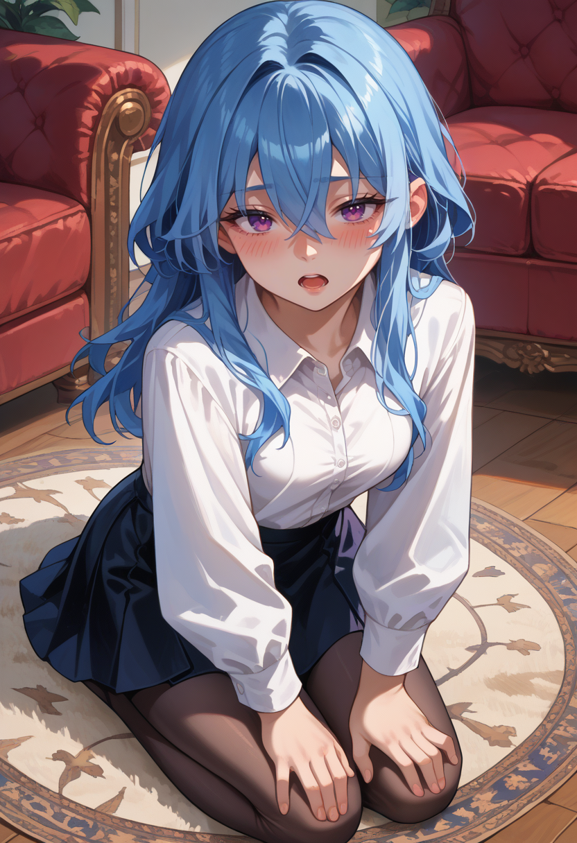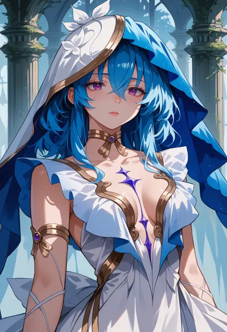 トリガー: wrnchwuwashorekeeper, blue hair, purple eyes, hair between eyes, long hair, breasts