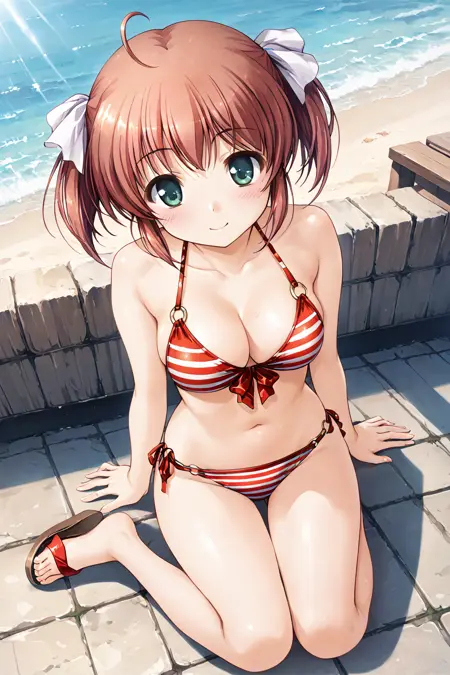swimsuit, bikini, red bikini, striped bikini, striped, front-tie top, o-ring, o-ring top, o-ring bikini, halterneck, navel,