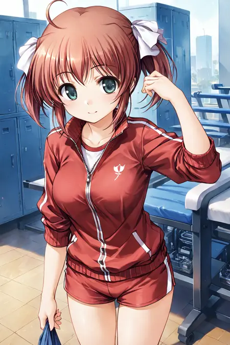 kodachi nagi, green eyes, aqua eyes, blue eyes, red hair, pink hair, short hair, twintails, short twintails, ribbon, ahoge, large breasts,