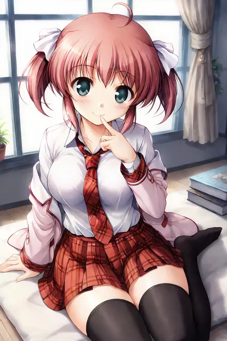 school uniform,necktie,red necktie,plaid necktie,bow,jacket,pink jacket,shirt,white shirt,long sleeves,skirt,plaid,plaid skirt,pleated skirt,thighhighs,black thighhighs,