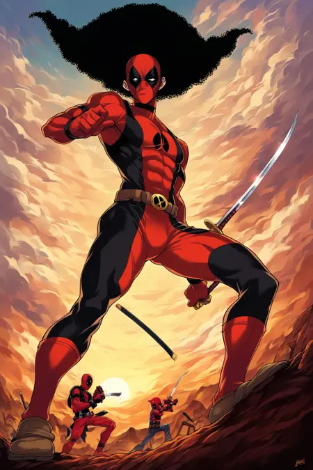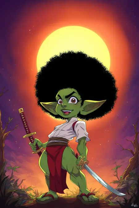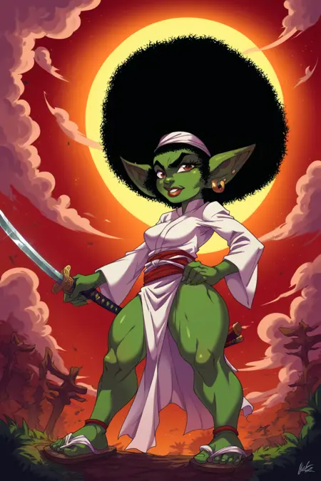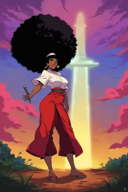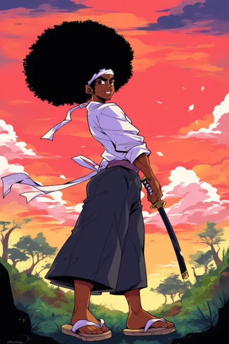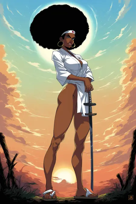 프롬프트: AfroSamarai, 검은 머리카락, 아프로, 카타나, 갈색 피부, 나무 샌들,