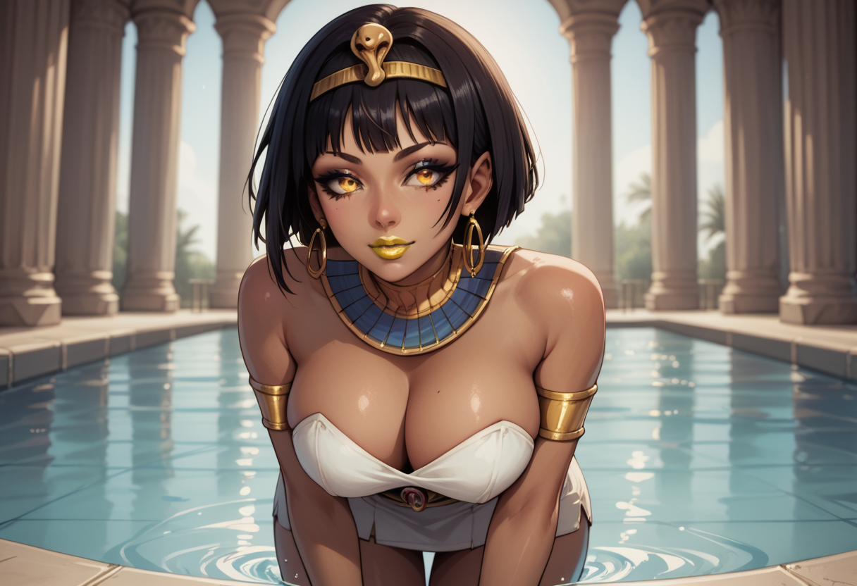 Opala, black hair, short hair, make up, eye liner, gold lips, gold lipstick, golden eyes, egyptian, tiara, earrings, large breasts, dark-skinned female, white strapless dress, cleavage, short skirt, jewelry, gold arm band,