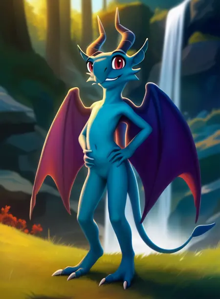 GargoyleHanlosMon, gargoyle, blue skin, horns, white sclera, red eyes, purple wings, pointed tail,