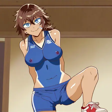 (( lora:onna\_tomodachi:1 , onna_tomodachi, beautiful brown hair, beautiful blue eyes, beautiful brown tanned skin, clear eyes, bright pupils, beautiful eyes, piercing eyes,low messy ponytail, messy bangs, huge and shaggy breast, thin waist, wide hips, sexy tan-lines, beauty, extraordinary beautiful girl, attractive woman, super sexy tanned woman, lustful tanned body, sexy tanned woman with seductive obscene body, sensual body, voluptuous body, sexy tanned slut, (band aid on left cheek, ) , )) ,