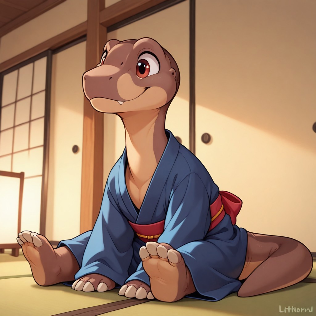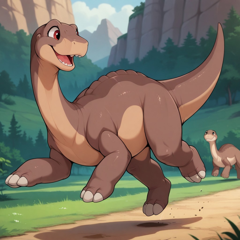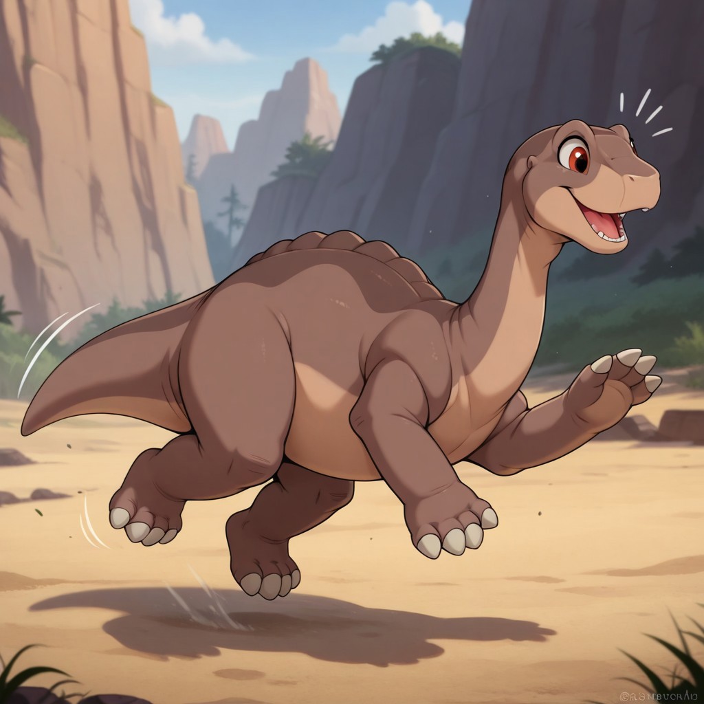 littlefootlbtil, feral, male, Apatosaurus, scalie, dinosaur, sauropod, brown skin, red-brown eyes,