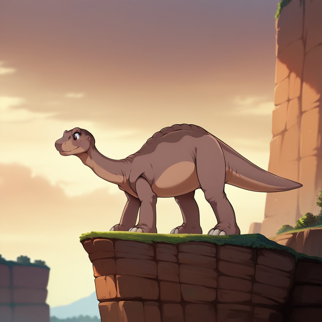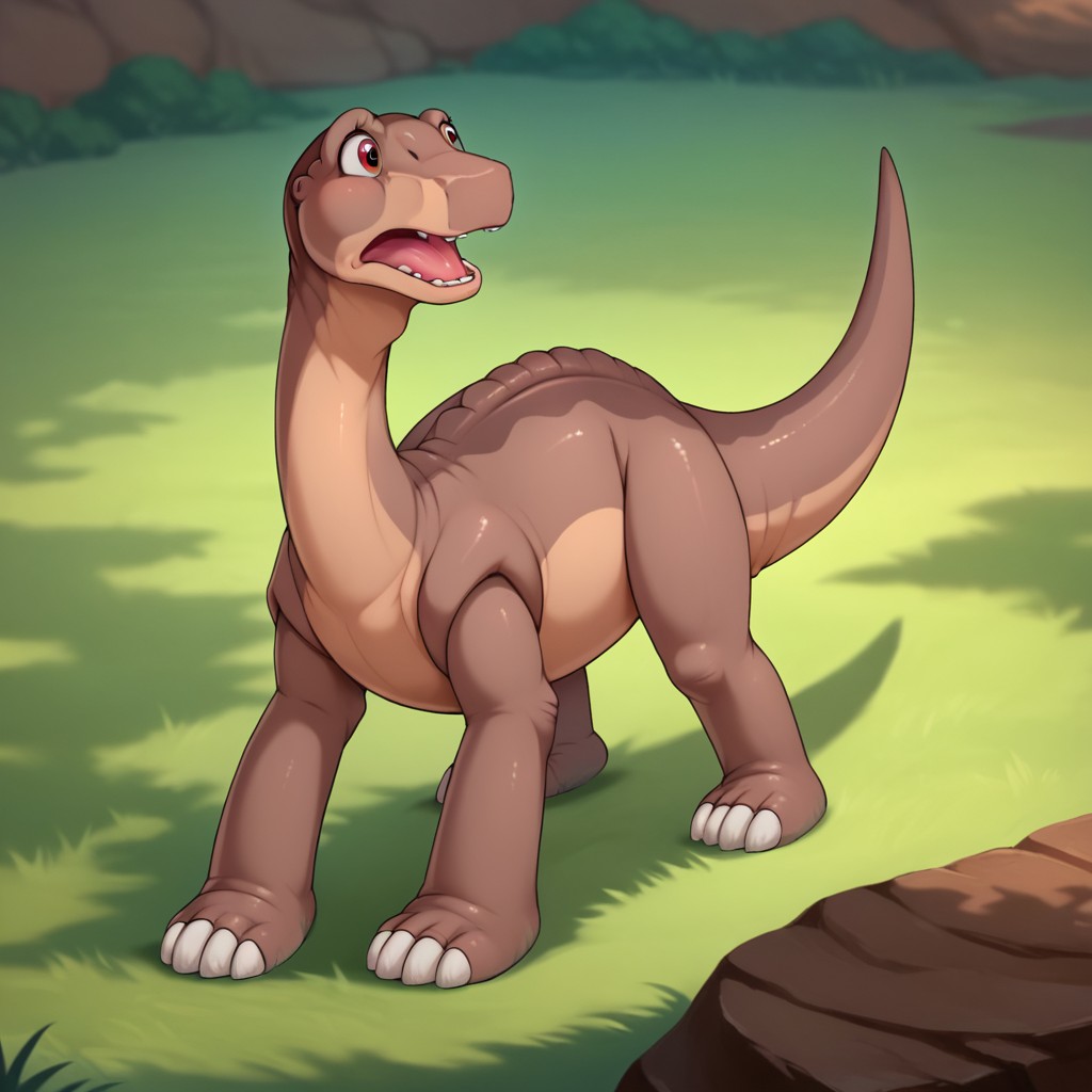 littlefootlbt, feral, male, Apatosaurus, scalie, dinosaur, sauropod, brown skin, red-brown eyes, quadruped,