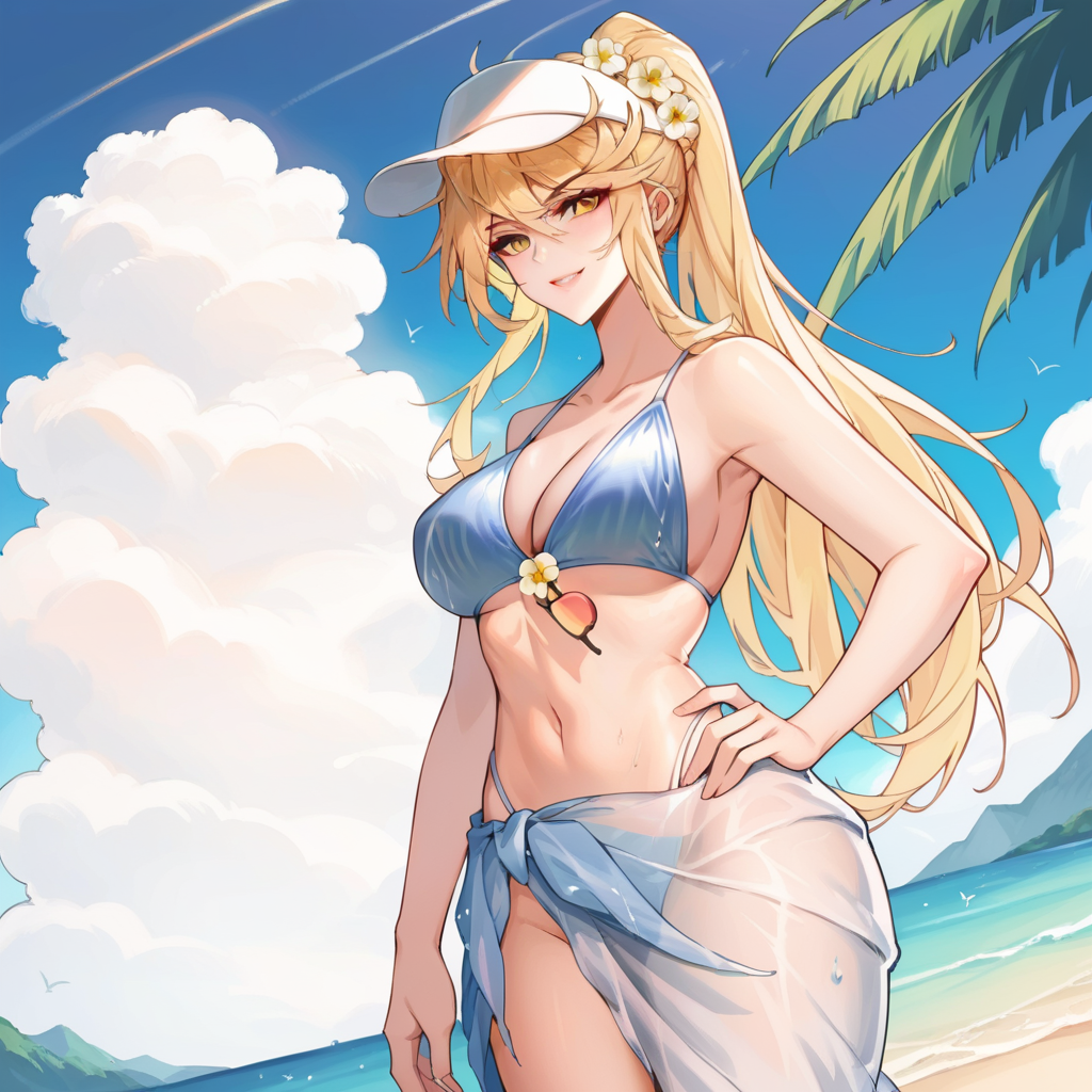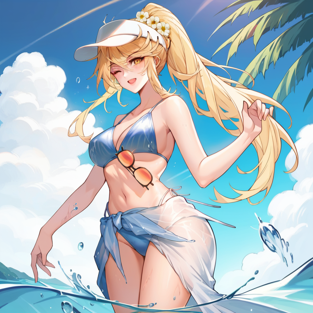 Jia_Swimsuit、青いビキニ、ストリングビキニ、ハーネスタイプ、透け感のあるサロング、バイザー帽、白い頭飾り、髪飾り、白い花、ハイレグビキニ、