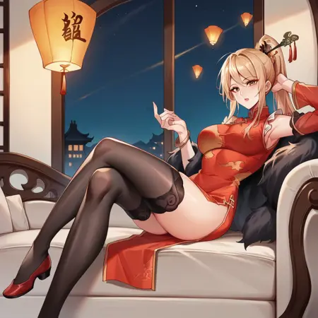 Jia_CN、髪留め、髪飾り、チャイナドレス、赤いドレス、袖が外れたデザイン、赤い袖、ブレスレット、黒いフェザーのボア、黒いハイソックス、
