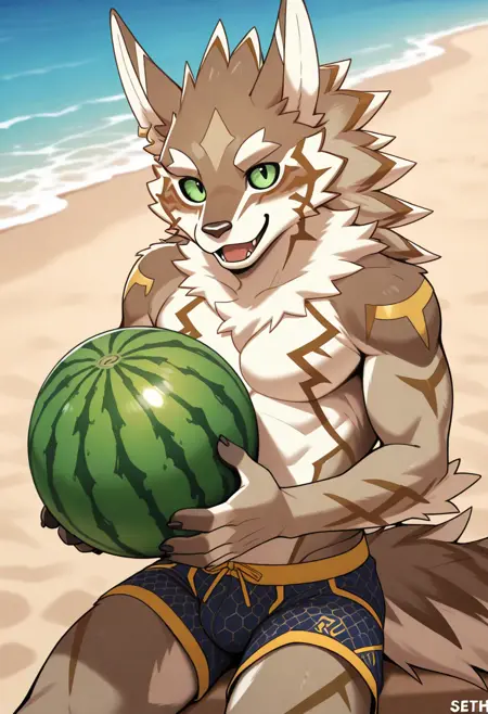 Illustrious: best quality, amazing quality, very aesthetic, absurdres, newest, seth, housamo, tokyo afterschool summoners, furry, male focus, 1boy, solo, green sclera, bara, boxers, happy, looking at viewer, ...your tags...