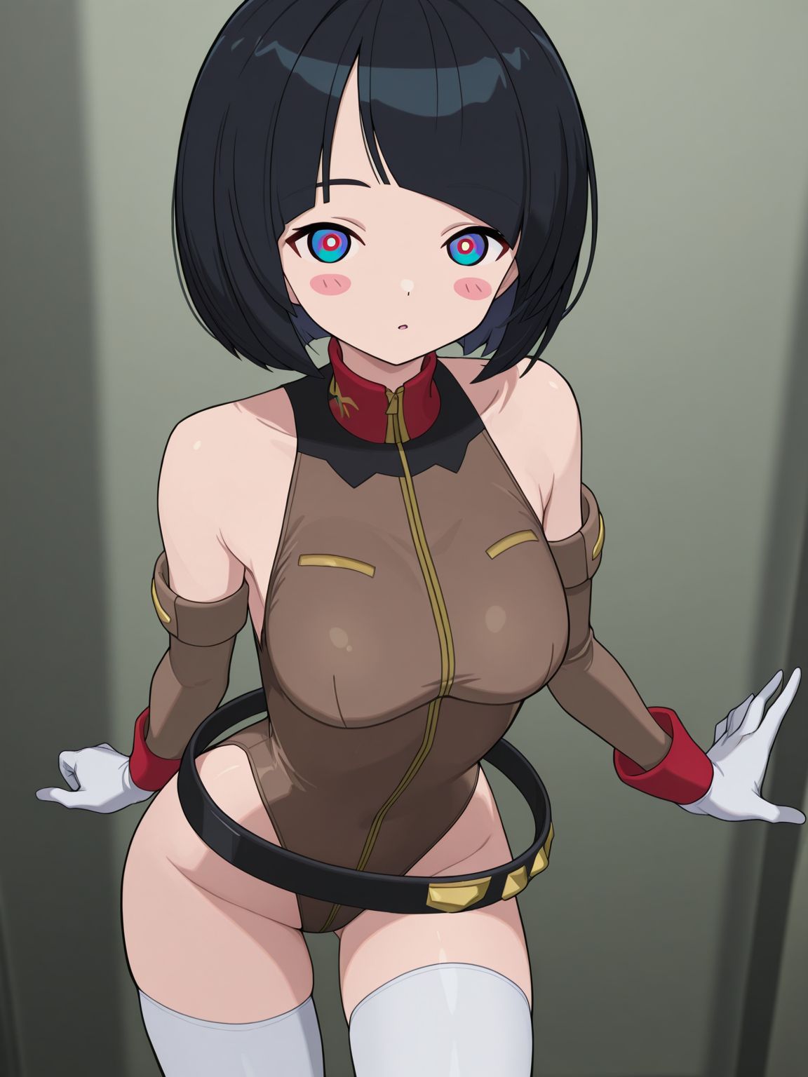 reileokhaki,brown leotard,leotard,highleg,highleg leotard,sleeveless turtleneck,bare shoulders,brown sleeves,detached sleeves,gloves,white gloves,belt,black belt,loose belt,thighhighs,white thighhighs,boots,brown footwear,high heels,high heel boots,