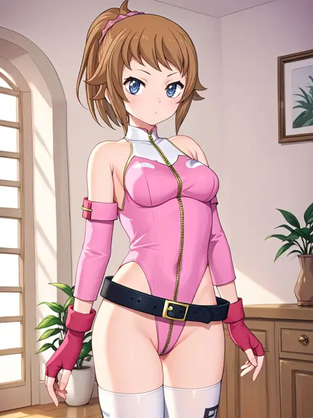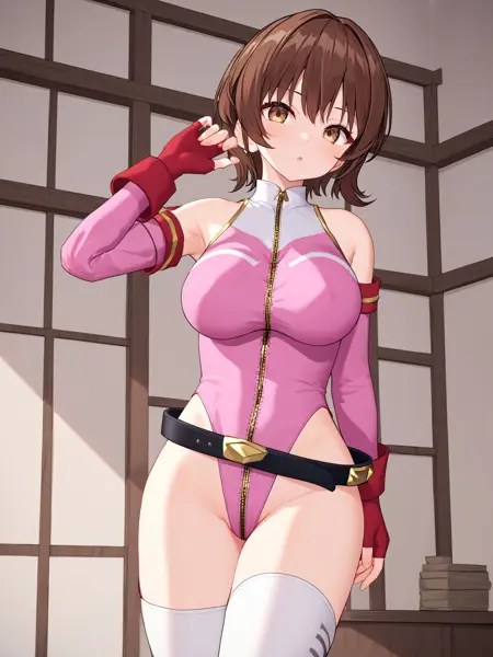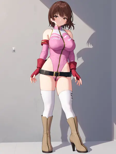 reileopink,pink leotard,leotard,highleg,highleg leotard,sleeveless turtleneck,bare shoulders,pink sleeves,detached sleeves,gloves,fingerless gloves,red gloves,belt,black belt,loose belt,thighhighs,white thighhighs,boots,brown footwear,high heels,high heel boots,