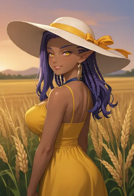 항상 필요: "elaishasub, 뾰족한 귀, 검은 피부를 가진 여성, 노란 눈, 귀걸이, 보라색 머리, 긴 머리, 락스타일, 큰 가슴"