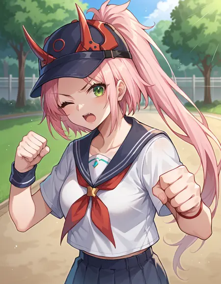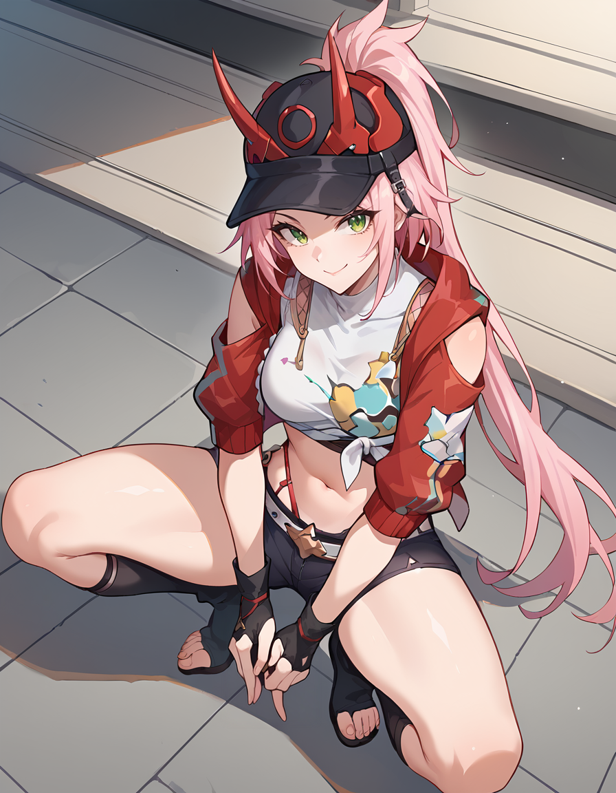 rappa_hsr, pink hair, ponytail, long hair, green eyes, hat, baseball cap, fake horns