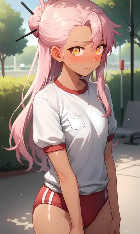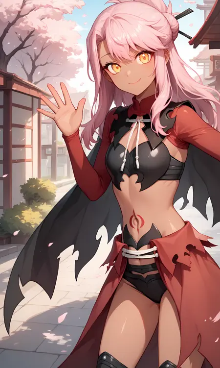 chloe, 노란 눈, 검은 피부, 분홍색 머리, 긴 머리, 머리 장식, 반쪽 올린 머리