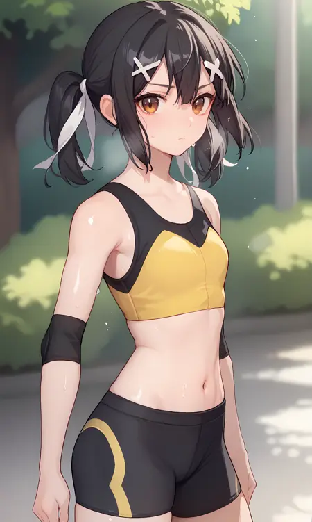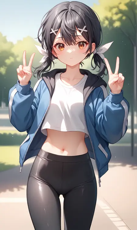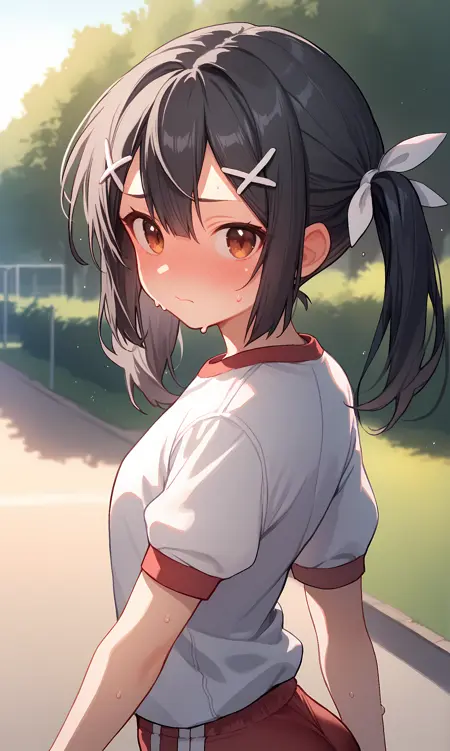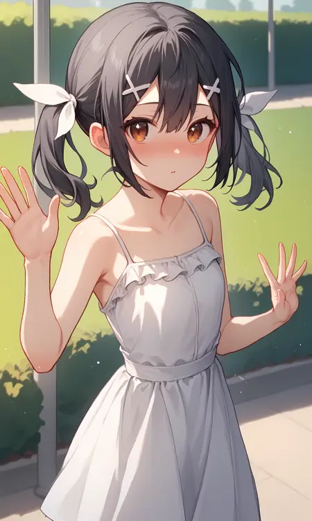 miyu, 갈색 눈, 검은 머리, 긴 머리, 짧은 트윈테일, 측면 머리카락, 눈 사이의 머리카락, x 모양의 머리 장식, 흰색 리본, 머리 리본