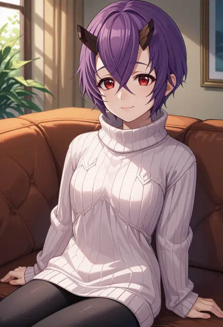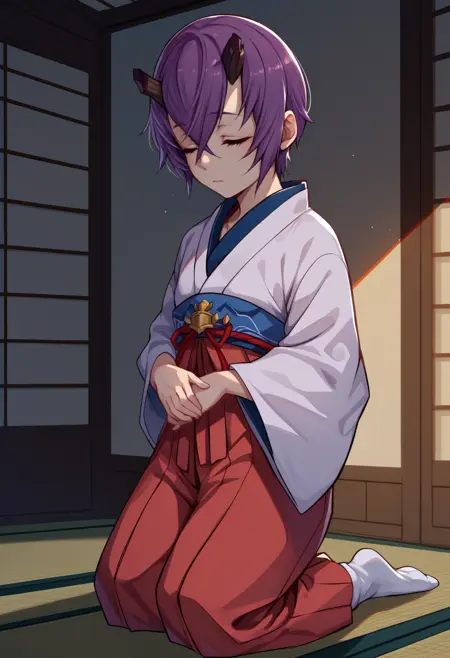 トリガー+外見: pcshinobu, 短い髪, 紫の髪, 黒い角, 折れた角, 赤い目