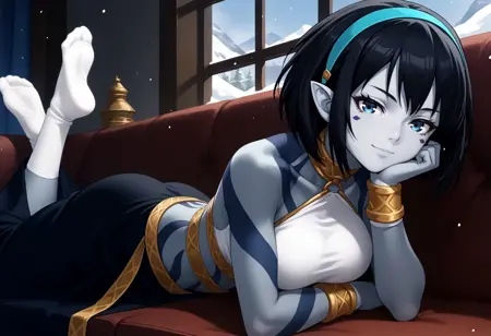 - 默认外观: celcToS,彩色皮肤,短发,黑发, Aqua 发带,蓝眼,面部标记,尖耳,颈圈,白衬衫,露脐上衣,裸露肩膀,纹身,腰腹,腕带,黑裙,长裙,侧开衩,O型环