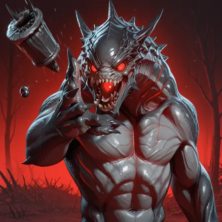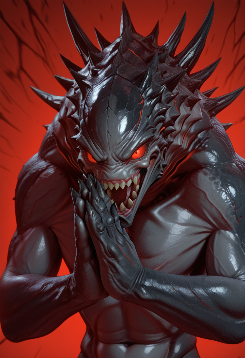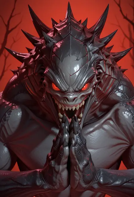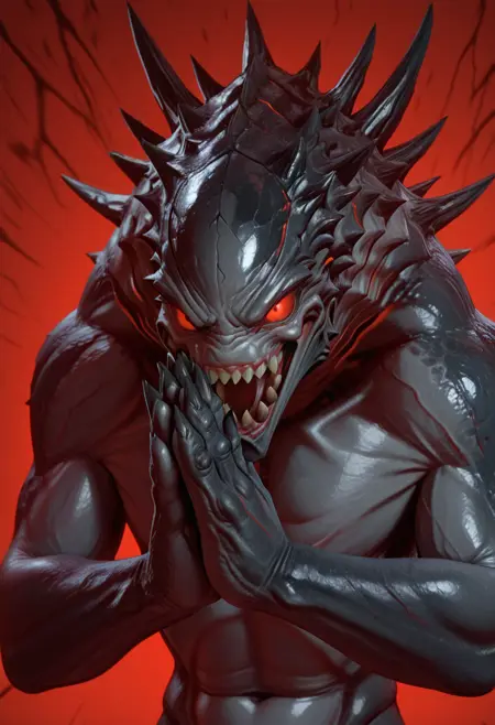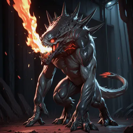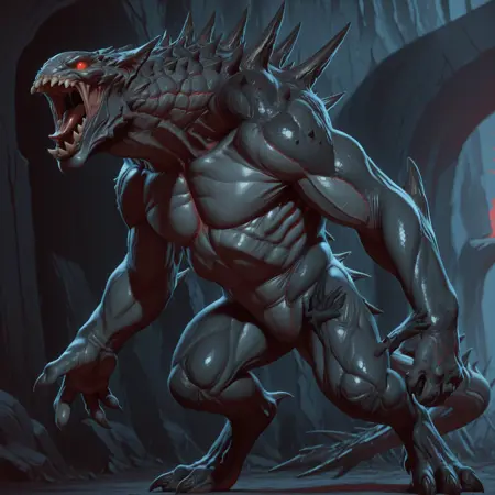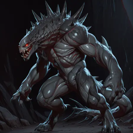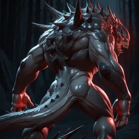需添加的额外文本:厚实的皮肤、背部有尖刺、红色发光的眼睛、红色发光的光效