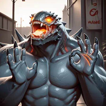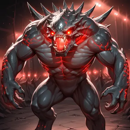 additional text to add: thick hide, spikes on back, red glowing eyes, red glowing lights