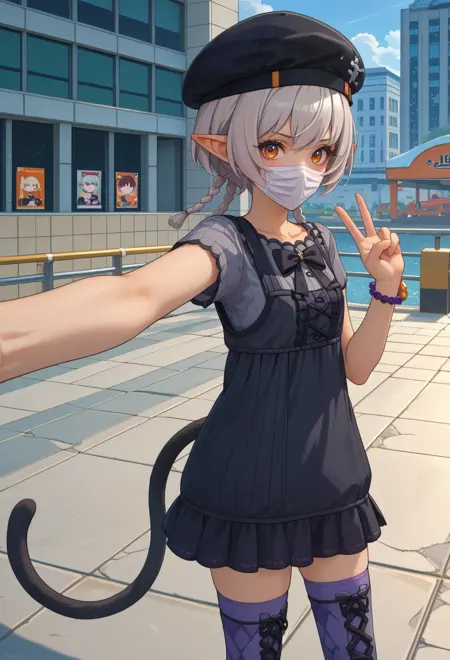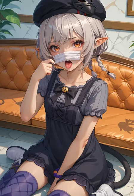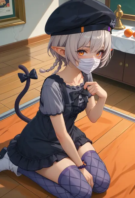입 마스크, 꼬리 리본, 검은 머리 장식, 베레모, 검은 리본, 회색 셔츠, 짧은 소매, 검은 드레스, 짧은 드레스, 중앙 프릴, 구슬 팔찌, 시계, 암블레이 무지개 패턴 양말, 회색 허벅지 양말, 보라색 허벅지 양말, 파란색 허벅지 양말, 부츠, 십자 끈 매듭, 흰색 신발, 젯타이 초이키,