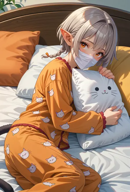 주황색 눈, 갈색 눈, 회색 머리, 짧은 머리, 낮은 트윈테일, 트윈 브레인, 뾰족한 귀, 동물 귀, 땋은 머리, 검은 고양이 꼬리, 검은 피부, 눈 밑 점,