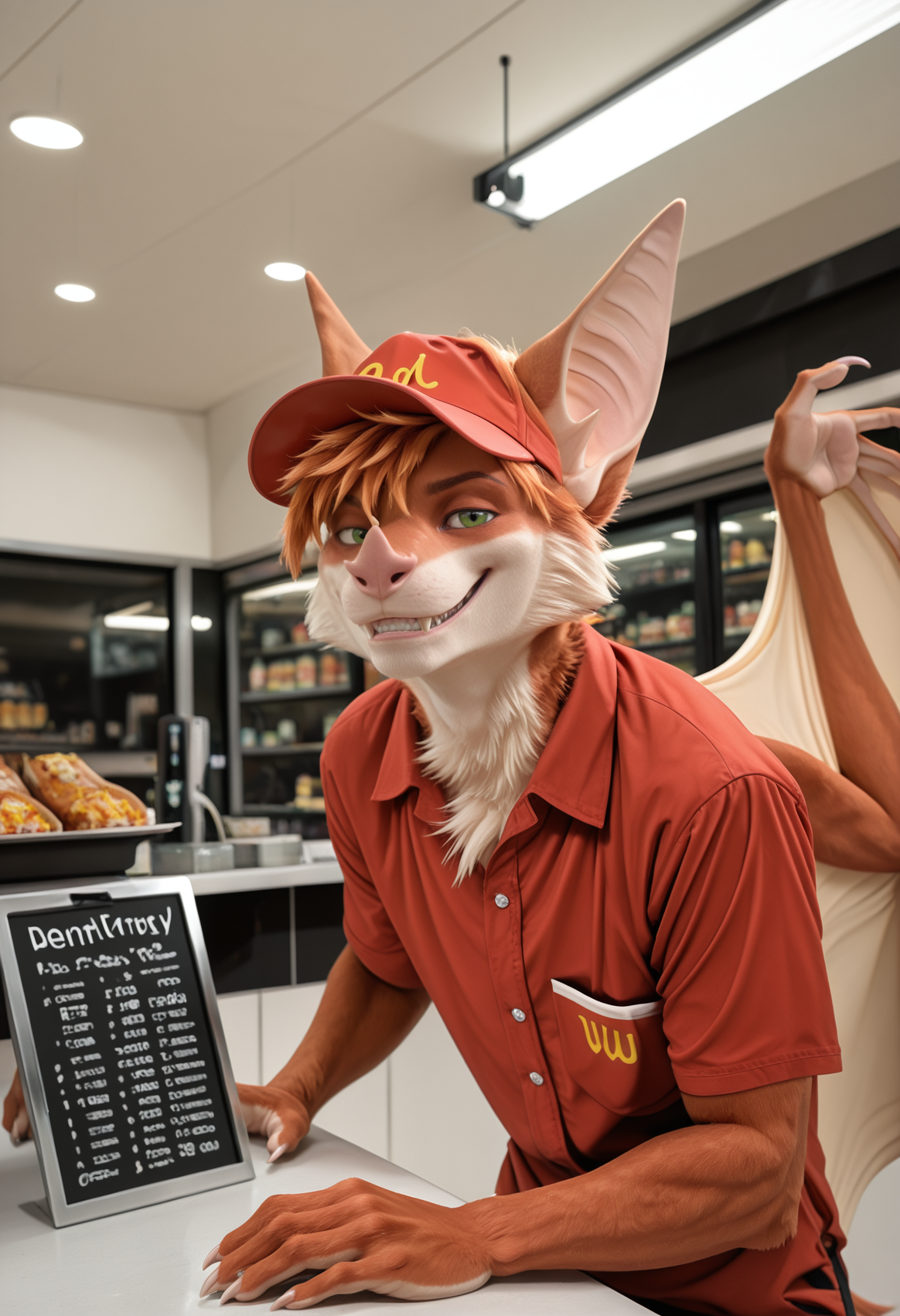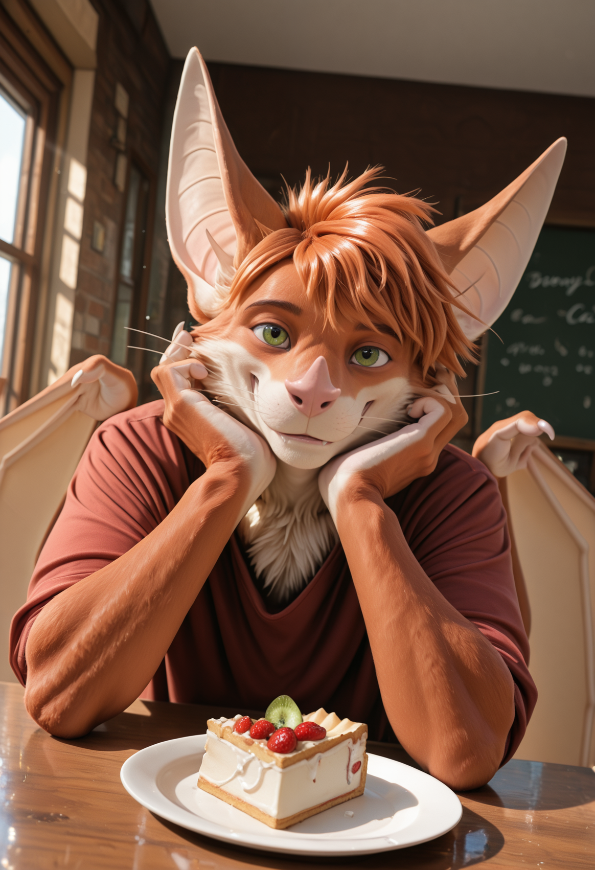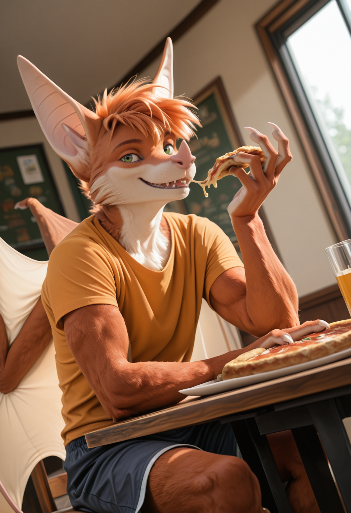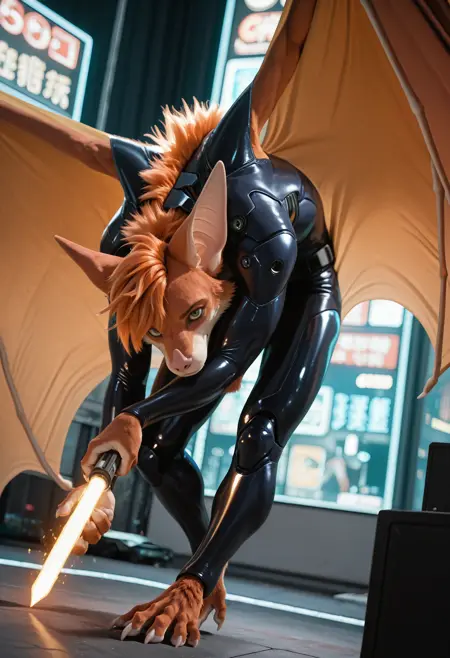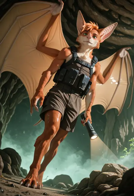 // Illustrious: a3rys_a3rysbat, mammal, bat, furry, solo, bat wings, 1boy, green eyes, body fur, male focus, tail, bat ears, claws, furry male, orange hair, whiskers