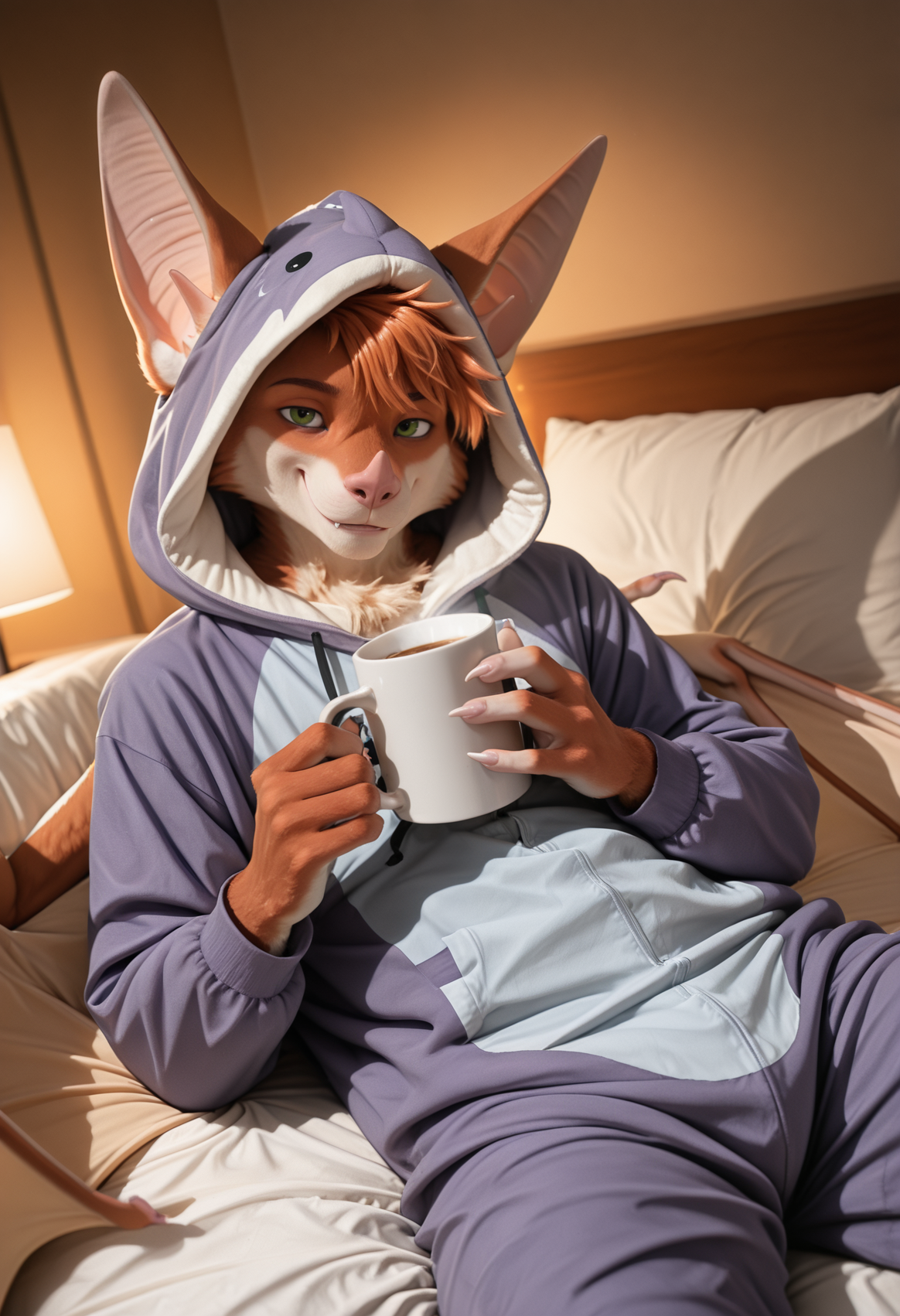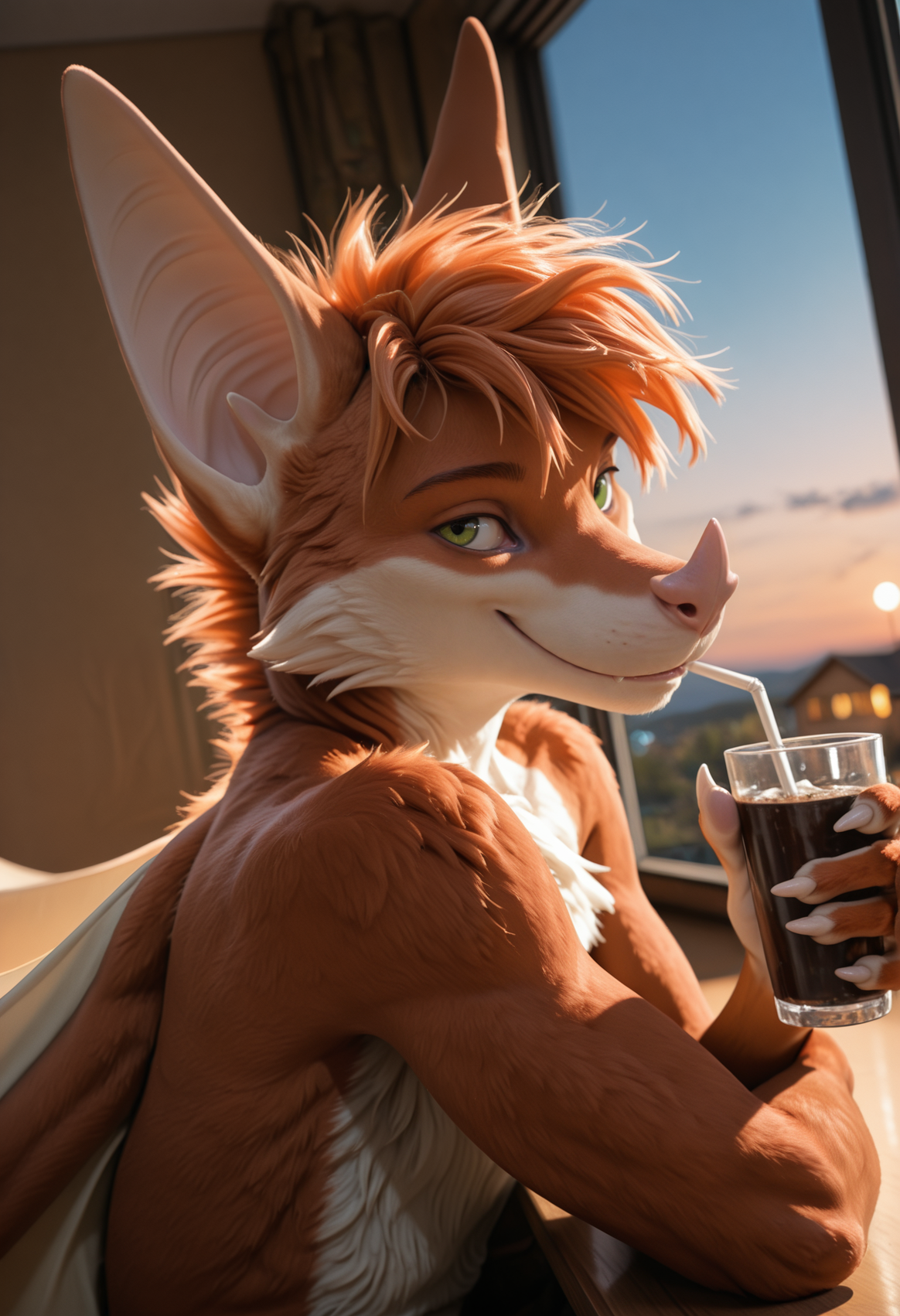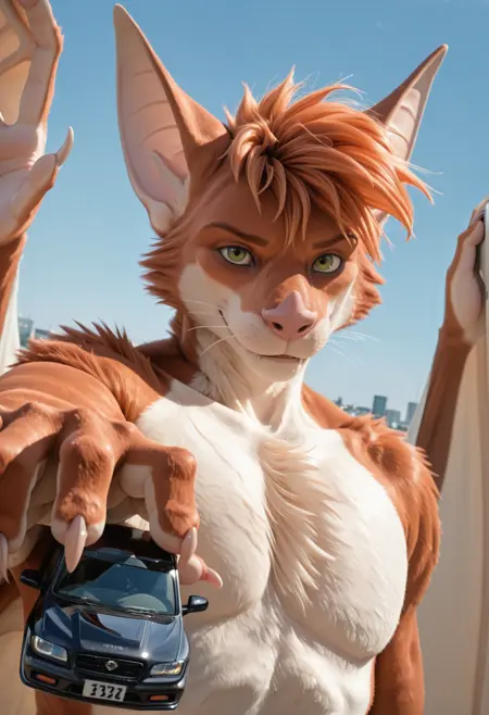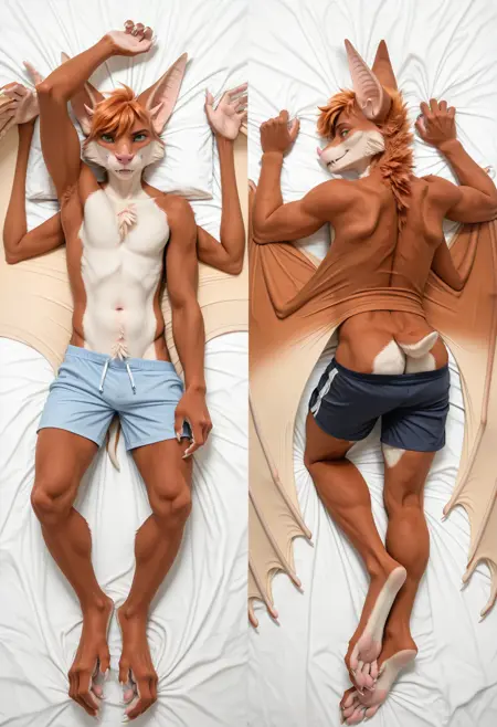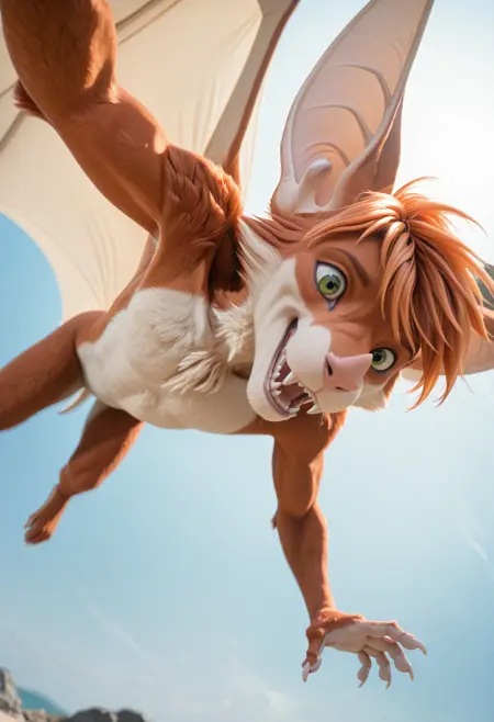 📝 **Aerysはオリジナルキャラクター(OC)**で、アンスロポモルフィックなメガバットとして描かれています。彼の体毛は赤みがかったオレンジ色で、胸と鼻先に白い模様があり、短くて乱れた髪、緑の目、大きな耳、長い舌を持っています。筋肉質な体には大きな革のような翼と爪のある手足が特徴です。彼はしばしばマクロなシーンで、支配的または遊び心のある狩猟的な態度で描かれます。
