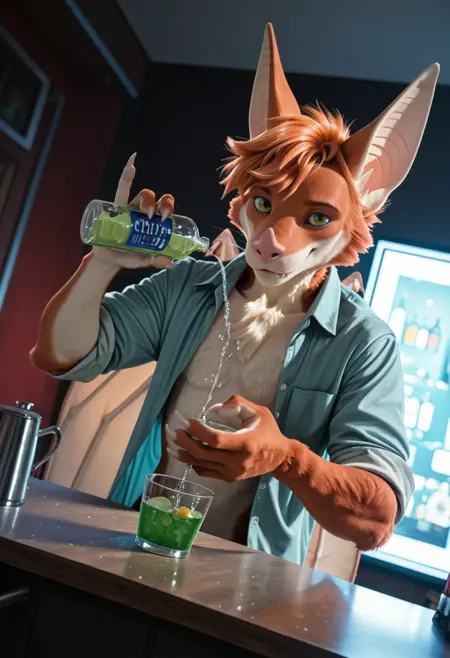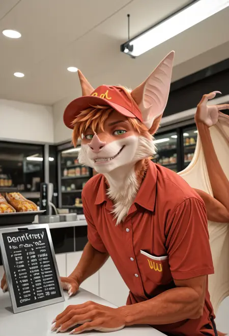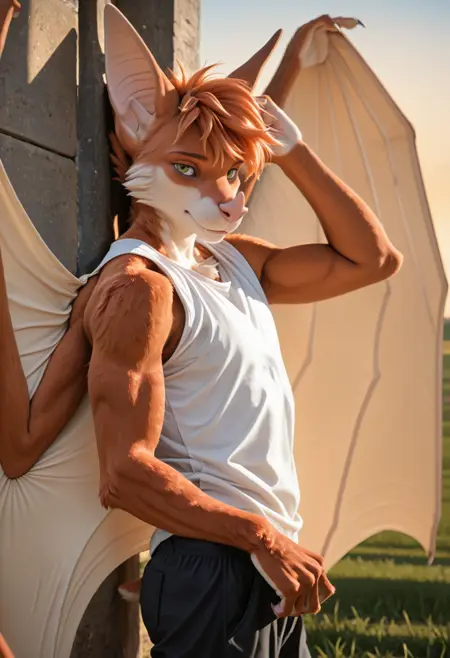 📝 Aerys — оригинальный персонаж (OC), представляющий собой антропоморфную летучую лисицу (megabat). У него рыжевато-оранжевая шерсть с белыми участками на груди и морде, короткая растрёпанная причёска, зелёные глаза, крупные уши и длинный язык. Фигура мускулистая, с большими кожистыми крыльями и когтистыми лапами. Часто изображается в макро-образе, в доминирующих или игриво-хищных сценах.