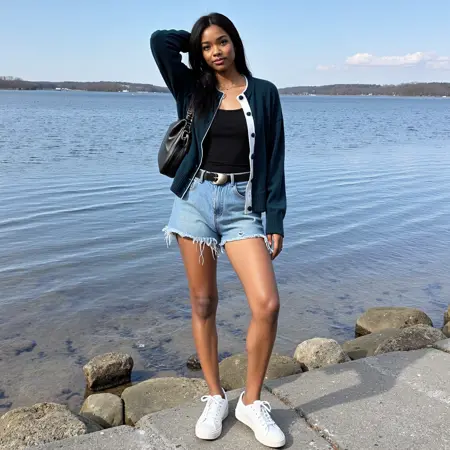A female internet celebrity stands in a rocky area against a backdrop of calm water and a clear blue sky. She is dressed in casual attire, including a dark green unbuttoned sweater that complements her relaxed yet fashionable style. Paired with the sweater are light-colored denim shorts, which add a touch of laid-back elegance to her look. On her feet, she wears white trainers that are both comfortable and stylish, and she carries a black shoulder bag that adds a practical element to her outfit. Her posture is relaxed and natural, with one hand casually resting on her head, as if she is truly enjoying the serenity of the outdoors. The surroundings suggest a recreational location close to the water, perhaps by a river or lake, providing a tranquil backdrop that enhances the subject's stylish casual style.