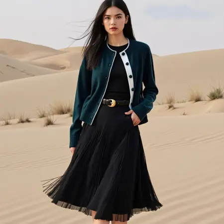 prompt:against the backdrop of a desert landscape, with rolling sand dunes and sparse vegetation. a Russian beauty is dressed in a light gray jzsweater. Paired with a black fringed maxi skirt, the hem flutters with her every step, adding a touch of movement to her look. A golden belt around her waist not only accentuates her figure but also adds a hint of luxurious shine to the overall outfit. Her long hair gently sways in the wind, and her makeup is delicately applied, with a deep lip color that further highlights her confidence and charm.