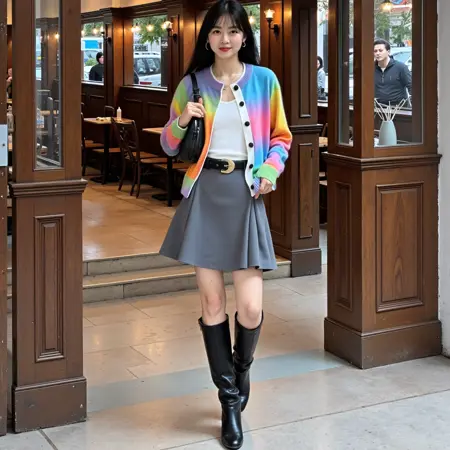prompt:A Russian girl is wearing a dark green unbuttoned jzsweater, which gives a relaxed yet sophisticated touch to her look. paired with a grey skirt that flares out in an A-line silhouette.Completing her ensemble are a pair of black boots , adding a modern edge, and she carries a black clutch bag that complements her attire. She is standing in an interior hallway or aisle. The background reveals the interior of a cafe or a similar establishment, with wooden door frames, chairs, and tables, indicating that this is a public space, likely intended for dining or social gatherings. The environment is well-lit, casting a bright and inviting ambiance throughout the scene.prompt: