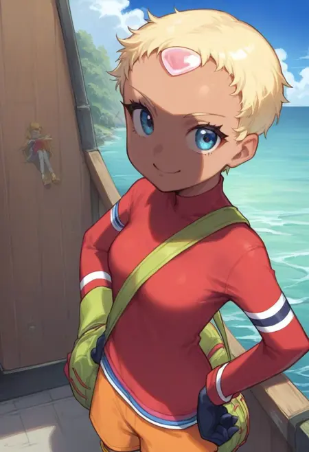 | 학습된 단어 | ChatTale, Tri-oval shaped gem, gem attached on forehead, elara, very short hair, short hair, pixie cut, blonde hair, dark skinned, brown skin, small breasts, tomboy, blue eyes, 1girl, solo,복사됨! Original outfit, trimmed fur pirate hat, pirate hat, long sleeves, red shirt, dark gloves, orange shorts, knee high boots, green bag,복사됨! |