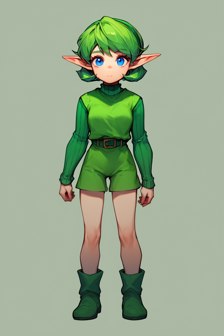 Canon outfit: green hairband, green sweater, ribbed sweater, green tunic, belt, green boots